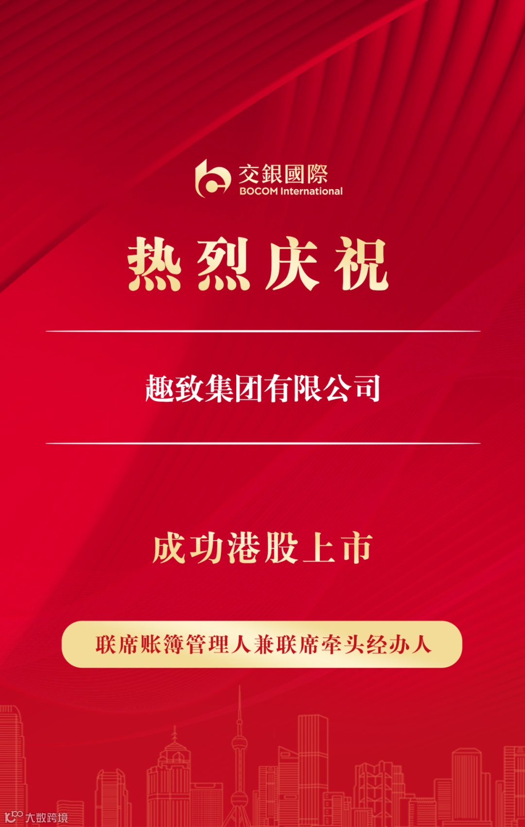 5月27日,趣致集团有限公司(“趣致集团”,917.HK)在香港联交所主板挂牌上市。趣致集团本次全球发售定价每股25.00港元,发行19,704,000股,融资规模约为4.9亿港元。交银国际担任联席账簿管理人兼联席牵头经办人,助力趣致集团登陆港股市场。