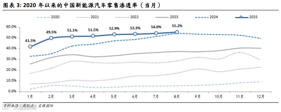 本文节选自交银国际已发布研究报告《8月新能源车渗透率升至55.2%,预计9月车市增长平稳》(2025/09/09)。