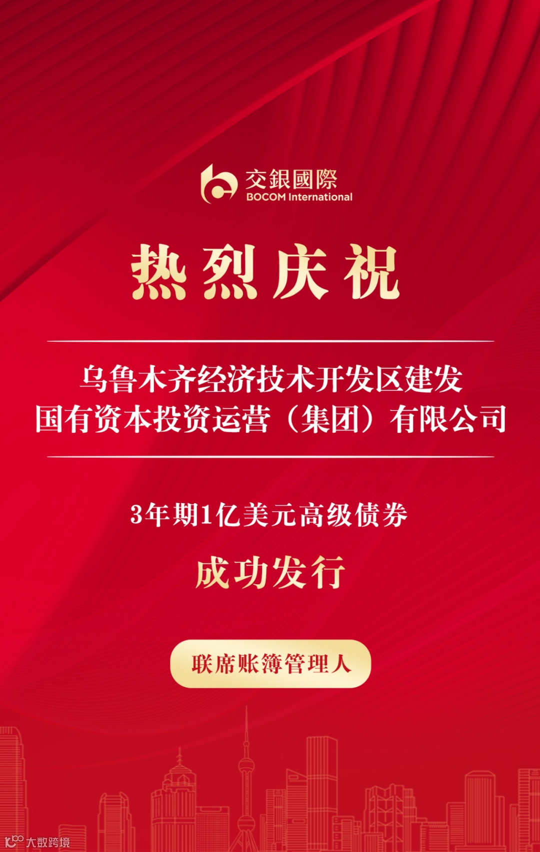 8月21日,交银国际作为联席账簿管理人助力乌鲁木齐经济技术开发区建发国有资本投资运营(集团)有限公司(“乌经开建发国资集团”)成功定价发行3年期1亿美元高级债券,发行收益率7.5%。