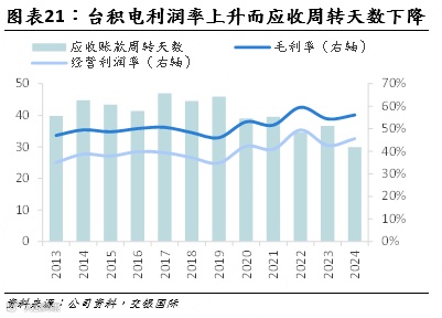 随着产品单价不断上升,公司部分财务数据也出现积极变化。例如,应收账款周转天数从2014-19年的40天左右,在5纳米制程上市之后的2020年开始呈下降趋势,降到2024年的30天左右。这或说明台积电对于客户的议价能力不断上升。