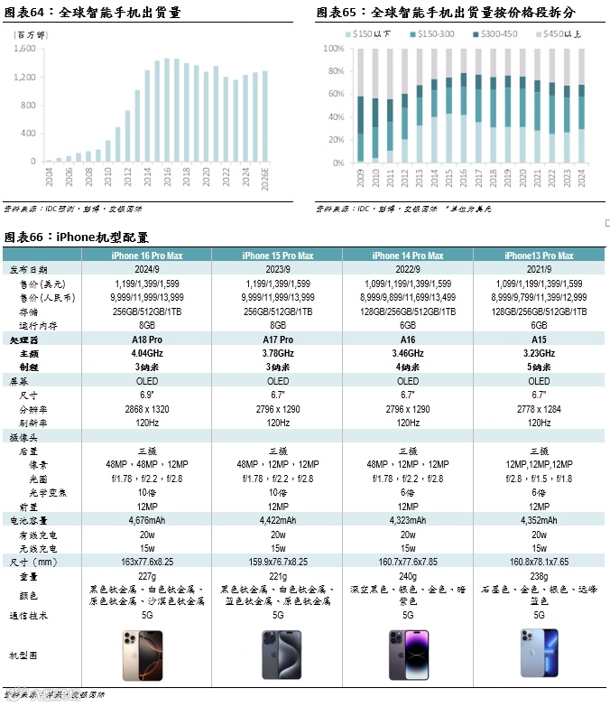 2010年之后的一段时间以来,智能手机曾是推动先进制程与技术进步的重要应用。以苹果手机为例,iPhone 13 Pro Max到iPhone 16 Pro Max的配置情况展示出,即使在摩尔定律放缓的时期以及智能手机下行周期,智能手机在屏幕、摄像头、电池等方面仍表现出积极的技术升级,内置SoC仍保持一年一次更新,对应主频、制程等参数也相应升级。