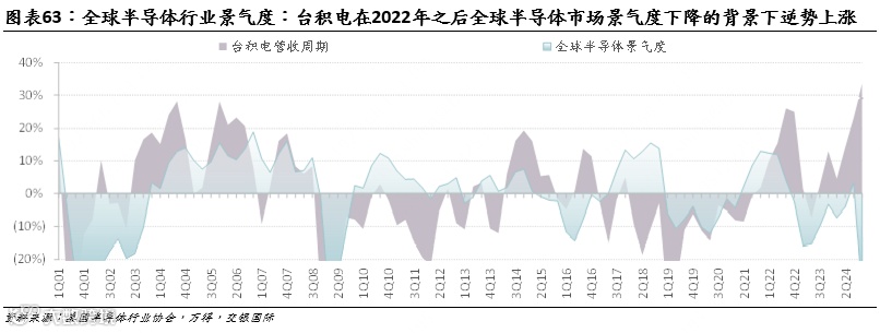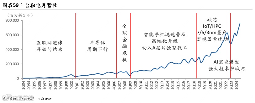 两条周期主线:1)台积电自身的产品周期。具体地说,台积电的产品制程节点在制程工艺技术进步的大背景下,结合半导体设备技术、制造工艺和后端封测技术发展规律,使得台积电新制程工艺产品符合周期性规律;以及2)全球先进制程逻辑集成电路市场的供需关系周期。全球先进制程逻辑芯片市场总需求随终端需求变化呈现周期性,且叠加不同应用的创新和技术进步,以及宏观或重大事件的影响在一段时间内出现需求上升或者下降的趋势。