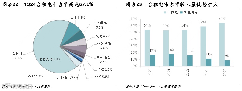 从市场份额来看,4Q24台积电在全球晶圆代工市场的市占率高达67.1%,远超市占率第二的三星电子的个位数市占率。这个优势在近两年有逐年扩大的趋势,2020-22年,台积电在晶圆代工的市占率一直徘徊在54%左右,市占率第二的三星电子市占率在17%左右。而由随着台积电3纳米工艺在2H23上线,当年台积电市占率即上升至59%,而三星电子市占率则在2023年下降到11%,2024年进一步下降到个位数水平。