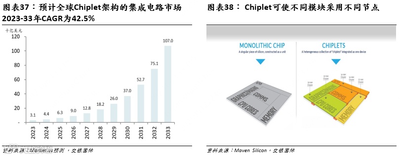 从市场规模看,根据Market.us的预测,全球Chiplet架构的集成电路市场规模或从2023年的31亿美元上升到2033年的1070亿美元,对应10年42.5% CAGR,远高于半导体市场总体个位数的年化涨幅。