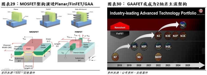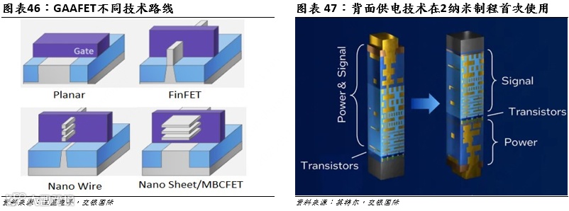 我们认为包括台积电、英特尔和三星电子已经为在2纳米之后使用GAAFET架构达成共识。革新使用GAAFET(Gate All Around FET)架构是之前2014年首次更新到FinFET架构后10+年以来第一次对晶体管架构做出重大更新。正如前文提到,基于FinFET架构的产品在FinFET量产近10年之后,出现漏电和交换反应速度过慢等物理极限。GAAFET作为一种多通道技术(Multi-Gate),将之前整体的通道设计转换为多个相互独立的通道(即每个通道都被栅极材料包围),从而解决电子遗漏和开关反应慢的问题。但这个架构的缺点就是使得整个晶体管的制造复杂度提高。