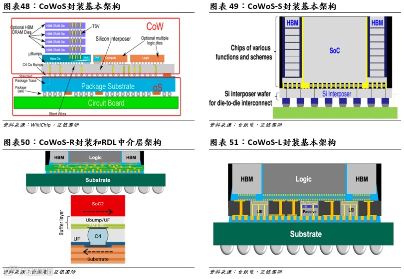 CoWoS(Chip on Wafer on Substrate)技术是将计算和存储等芯片首先固定在晶圆上(Chip on Wafer),然后进一步堆放在基板上(on Substrate)的过程。具体看,在堆叠芯片到晶圆中介层(Interposer)的过程中,通过中介层上的微凸点或微凸块实现芯片间的高效互连,因此可以大幅提升芯片间数据传输速率与性能。2.5D封装技术在实现芯片间高密度互连的同时,有效降低了功耗与封装尺寸,适用于高性能计算、人工智能加速器、网络交换机等对数据传输速率与系统性能要求极高的应用场景,特别是在有涉及到连接HBM与ASIC或者GPU电路时的效果最为显著。CoWoS的关键难点是将不同的芯片堆叠在同一片硅中介层实现多颗芯片互联。在硅中介层中,台积电使用微凸块(μBmps)、硅通孔(TSV)等技术,代替了传统引线键合用于裸片间连接,大大提高了互联密度以及数据传输带宽。