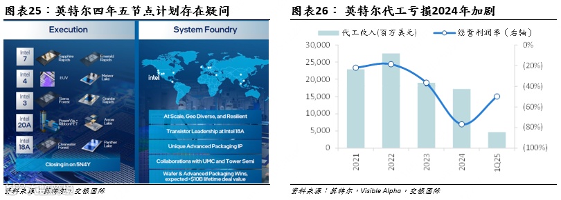 但大量的资本投入却未能在短期内快速提升公司在先进制程上的技术水平。更重要的是,英特尔在大量资本投入的过程中未能吸引到除其自身产品部门外的大客户。虽然有类似微软、英伟达、博通等科技企业称其正在测试英特尔的代工厂,但我们认为这些短期内收入贡献比例较低。由于传统的半导体设计公司或担忧英特尔的代工技术能力,同时担忧英特尔作为IDM是否会对半导体设计公司造成竞争,英特尔晶圆厂在最尖端先进制程上的进度令投资者近两年内一直远低于市场预期。2024年4月,英特尔转变财务汇报方法,将英特尔产品部门(Intel Product)和代工厂(Intel Foundry Services IFS)的财务细节分开报告。这次汇报拆分引起了投资者对于 IFS能否在短时间后扭亏为盈的很大担忧。2025年3月初,根据路透社报道,博通和英伟达或正在重新尝试通过英特尔代工小于2纳米的芯片,但我们认为真正转化外部客户订单仍需要时间。