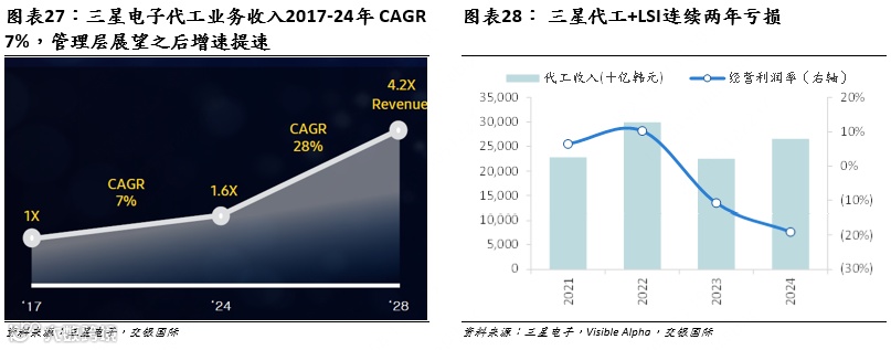 财务上,根据三星电子的数据,其晶圆代工收入在2017-24间仅有7% CAGR,远低于台积电同期的17%。三星晶圆代工厂和LSI(Large Scale Integration)相加的经营利润率也在2023和2024年录得亏损。我们认为,这或与3纳米产品上线后三星电子代工厂良率过低有关。我们认为晶圆代工行业存在收入反哺资本开支的正向反馈,在一个特定节点的收入下滑或利润减少或对三星之后的竞争能力造成负面影响。