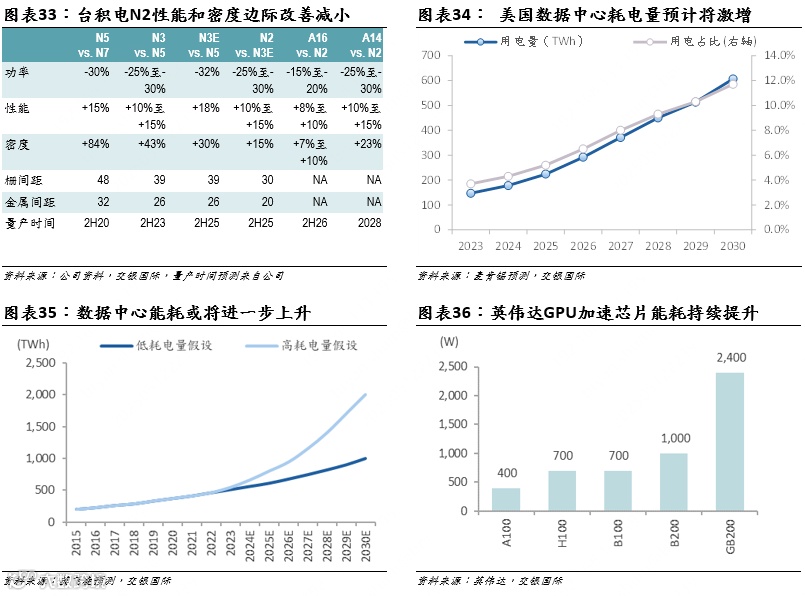 从衡量制程节点的关键指标PPA来看(Power功率功耗,Performance性能/计算速度,Area尺寸面积或者Density即单位面积可以容纳的晶体管数量)。比较台积电2纳米、3纳米与5纳米的技术细节,我们发现2纳米相对于3纳米,其边际上的大多数技术提升要小于上个产品周期(即3纳米到5纳米)的技术进步。且这种趋势随着制程节点的不断进步,有愈演愈烈的趋势。例如 N2节点相较于N3E节点,其晶体管密度仅增加15%,而更先进的A16相较于N2,晶体管密度仅上升高个位数。同样地,计算速度提升在A16节点提升高个位数,较之前的提升幅度进一步收窄。但是,我们同时发现,与之前技术升级相比,在相同条件下,新节点在功率上的改进仍保持较快进度。从N5到N2,每代新的制程节点较上节点的能耗均在30%左右,而A16也相较N2节能20%左右,节能的边际提升要优于PPA中其他主要参数。2025年4月底,台积电透露其A16之后的下一代节点A14或在2028年前后上市。A14是即N2之后第二个提供完整代际性能提升的节点。在各个PPA的技术参数中,A14再次在能耗上提供最大进步,相对于N2,A14提供25-30%的能耗性能提升,高于晶体管密度和计算速度的提升。