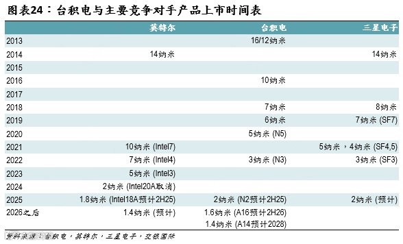 我们对比台积电、英特尔和三星电子的产品路线图,竞争对手虽在产品路线和技术上不输于台积电,但都在以上部分条件上与台积电存在一定差距。
