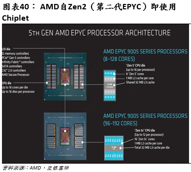 对于台积电来说,其主要客户都开始在新产品中陆续使用Chiplet架构。作为Chiplet技术的最早倡导者之一, AMD是最早在业界商用化Chiplet技术的芯片设计商。AMD 从 2012 年开始开发一种有多种应用的 64 比特 x86 架构Zen。为追赶英特尔在 CPU 领域的领先地位,自从苏姿丰和芯片架构师 Jim Keller 2012 年加入公司以来,Zen 架构的开发有了长足的进步。Zen 架构的一个特点是就是兼顾了设备性能表现、效率和可延展性。其服务器CPU产品EPYC系列,从2019年推出基于第二代Zen架构(Zen2)的产品EPYC Rome系列开始便采用Chiplet技术,广受市场好评,逐步抢到部分英特尔的服务器CPU市场。其最新的基于Zen 5和Zen 5c的EPYC Turin系列在2024年推向市场,最多可以支持192个Chiplet内核。