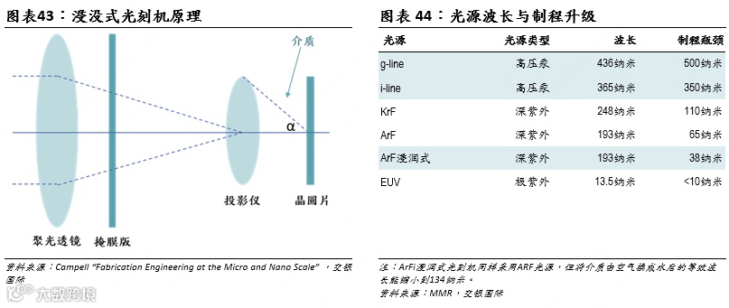 这里k1用来衡量环境及一系列工艺技巧对分辨率影响。环境因素包含温度、湿度、光刻胶和掩模版的属性等(包括光刻胶和掩模版的聚合度、分子量、颗粒度、感光剂、硅片平整度、光的入射角度、杂质/灰尘等)。λ代表光刻机光源的波长。缩小光刻机光源波长是提升分辨率、减小CD值的最直接的方法。业界目前最常见的光刻机有DUV光刻机,其使用ArF光源波长为193纳米。EUV光刻机将光源改为极紫外光,可将波长降至13.5纳米,所以EUV光刻机比DUV光刻机更加容易获得更小的CD。