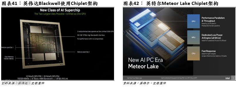 英伟达在其最新的Blackwell加速芯片上也使用了Chiplet技术。相较于之前Hopper架构整体式裸晶,Blackwell在英伟达AI加速系列芯片上首次应用Chiplet技术将两颗相对独立的B100 小芯片整合。事实上,之前英伟达为了实现其NVLink标准在芯片间的高速通信需求,曾研发基于Chiplet的NVLink-C2C技术连接CPU,GPU等芯片组成部分。虽然英伟达在使用Chiplet技术的广度上要小于AMD,但我们认为行业龙头使用Chiplet技术或预示芯片设计行业的趋势,而Chiplet的使用或在一定程度上提升先进制程的需求。