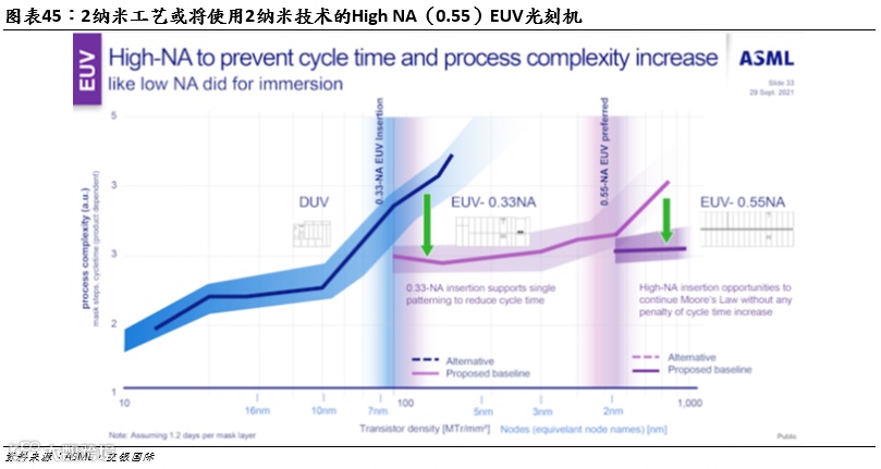 现有的EUV光刻机(用于制造7纳米/5纳米/3纳米制程芯片)使用13.5纳米的波长。ASML EUV光刻机3400C产品使用k1、λ、NA分别为0.25、13.5纳米、0.33。一般认为EUV单次曝光对应台积电7纳米制程工艺,而投资更先进的光刻机技术或在经济上可以弥补多次曝光的良率和效率上的损失。业界(这里包括ASML等设备厂商,台积电、英特尔等涉及到先进制程的IDM或代工厂,以及众多的半导体设计商的综合意见)判断,NA=0.33的光刻机或可以支持从7纳米到3纳米制程工艺节点,而2纳米节点业界或使用High NA (NA=0.55)。ASML称其5000系列“High NA”已经在2023年12月开始交付英特尔(18A节点),并在2H24交付台积电测试使用。
