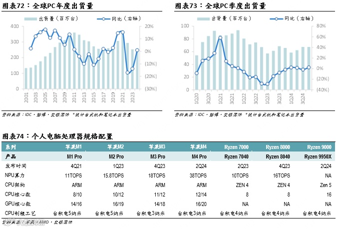 作为HPC的另一组成部分,PC业务受益于周期复苏和Windows升级驱动。根据IDC数据,全球PC(台式机和笔记本)出货量在2020年和2021年受居家办公需求爆发式增长,连续两年同比增长15%。2022年和2023年出货量受前期高基数、以及全球宏观经济等影响同比分别下降17%和14%,PC厂商也经历了两年的去库存时期。2024年全球PC出货量开始恢复平稳增长,出货量同比增长1%。同时,下游PC OEM 库存基本稳定,我们预计全球PC出货量或进一步周期性复苏,并受Window 10周期结束影响2025年或实现3%左右的同比增长。而2026年之后2纳米制程产品或将开始装配在PC产品上。