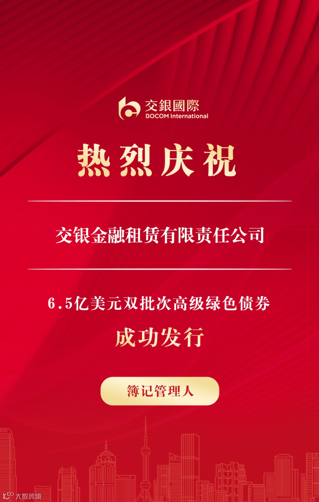 8月19日,交银国际作为簿记管理人助力交银金融租赁有限责任公司(“交银金租”)成功定价3年期固息浮息双批次美元高级绿色债券,订单峰值近5倍,发行规模共6.5亿美元。交银金租3年期固息及浮息批次分别以T3+105bps区间和SOFR+125bps作为初始价格指引向市场宣布,投资者认购踊跃,最终价格指引分别收窄40bps和50bps至T3+65bps和SOFR+75bps。