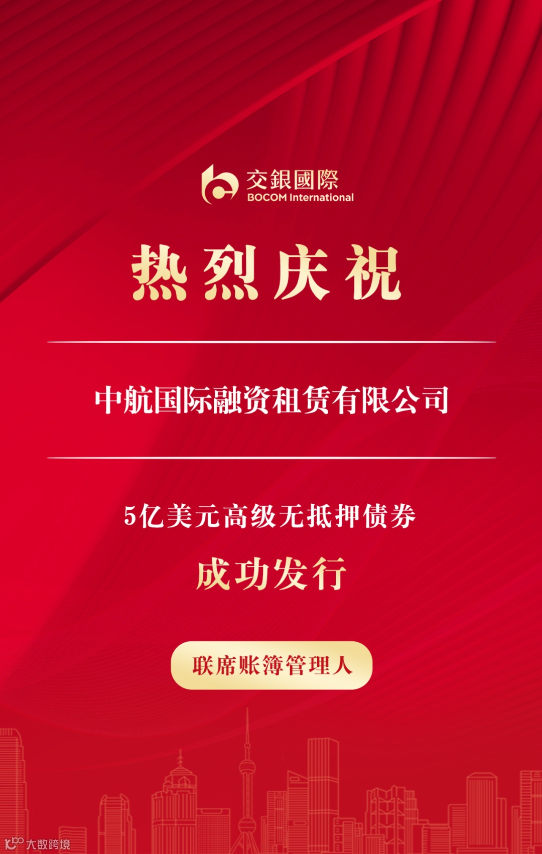 3月12日,交银国际作为联席账簿管理人助力中航国际融资租赁有限公司(“中航国际融资租赁”)成功发行5亿美元3年期高级无抵押债券,票面利率5.15%。本次发行获投资者踊跃认购,订单簿峰值超5倍,最终发行收益率较初始价格指导大幅收窄42.5个基点,超过金融机构美元债券发行的一般收紧幅度。