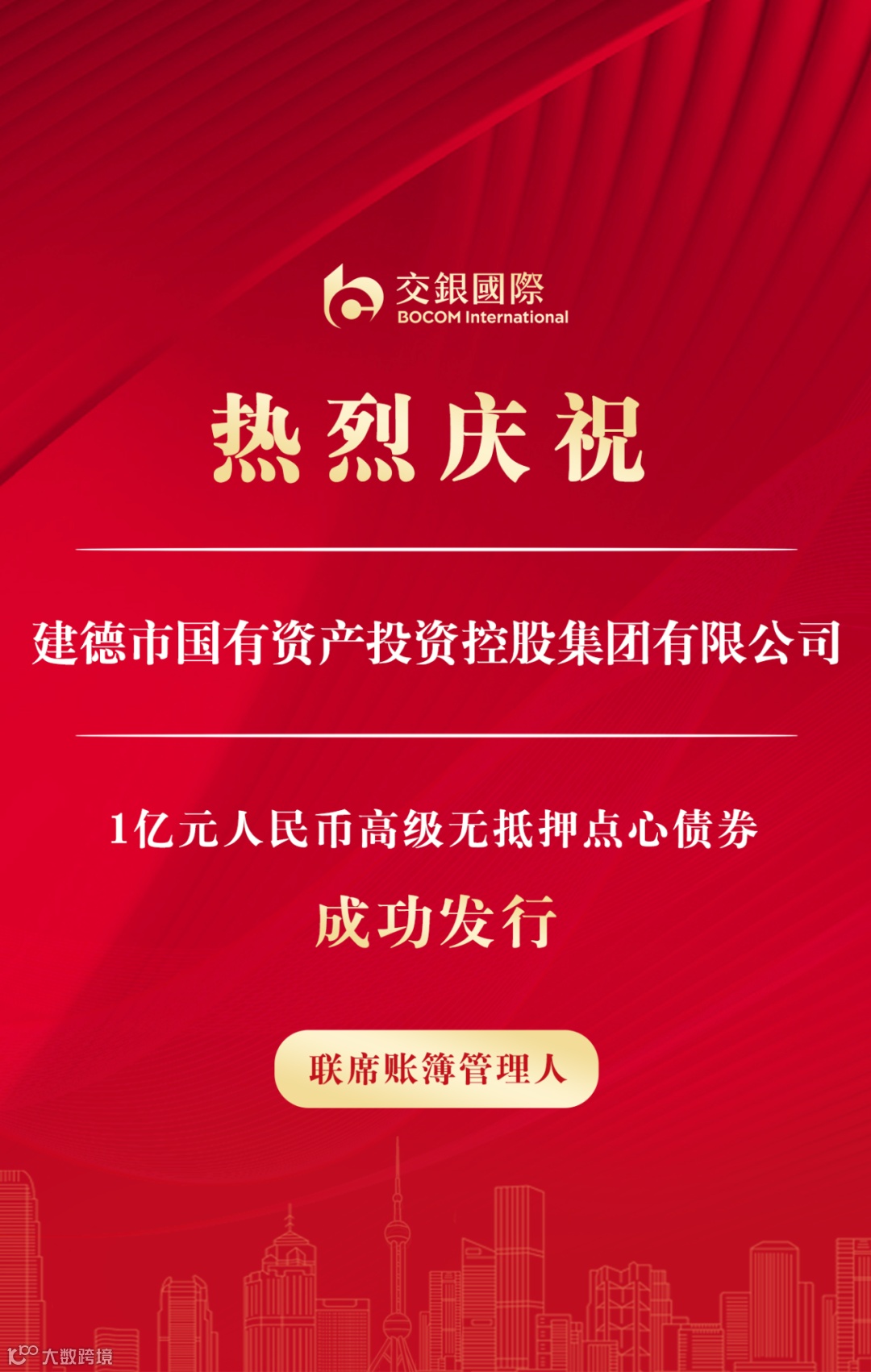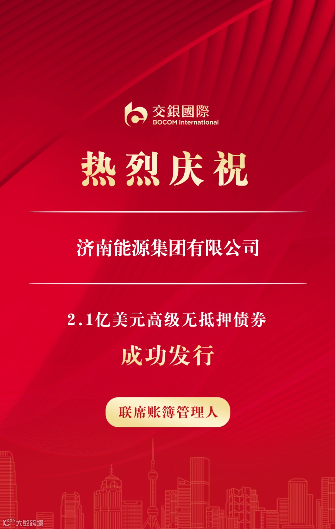 近期,交银国际作为联席账簿管理人助力济南能源集团有限公司(“济南能源”)成功发行2.1亿美元14个月高级无抵押债券,票面利率5.84%。交银国际作为联席账簿管理人助力建德市国有资产投资控股集团有限公司(“建德国资”)成功发行1亿元人民币高级无抵押点心债券,票面利率5.20%。