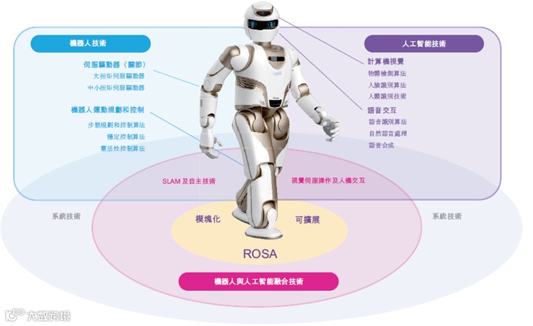 优必选拥有行业领先的全栈式研发技术。技术布局主要包括机器人运动规划和控制、伺服驱动器,对应人类的身体(关节运动);人工智能技术布局主要包括计算机视觉及语音交互技术,对应人类的大脑(感知);二者共同赋能机器人与人工智能融合技术(主要包括SLAM[1]及自主技术、视觉伺服操作及人机交互,对应小脑),并通过公司自主开发的机器人软件操作系统应用框架(ROSA)实现功能的完善和控制。
