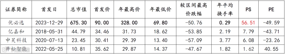估值方面,人形机器人在二级市场标的稀缺,选取国内从事物流机器人的亿嘉和、申昊科技和井松智能作为比较标的。受益“具身智能”的概念催化和纳入港股通名单,优必选的总市值和区间行情表现遥遥领先,最新市值达到675亿元港元。但近一个月股价进入下滑行情,最新价较区间最高价回撤幅度已超过50%,基本与同业同频回落。