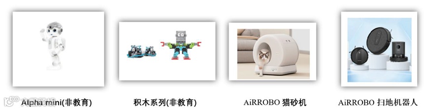 公司消费级机器人主要适用于不同家居应用场景,分为Alpha mini悟空(非教育)、积木系列(非教育)、AiRROBO空气萝卜猫砂机机、AiRROBO空气萝卜扫地机器人。