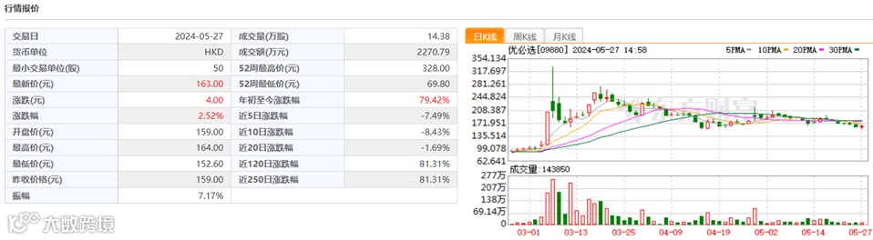 截止最新收盘日(2024年5月23日),区间最高价达到328港元/股(+264.44%),最低价69.80港元/股(-22.44%),最新收盘价159.00港元/股。由于上市前股东和基石投资人亦庄国际控股(香港)有限公司[4](认购5亿元人民币,占总募资额的53.41%)分别处于1年和6个月锁定期,重大股东还未到套现离场的时机。