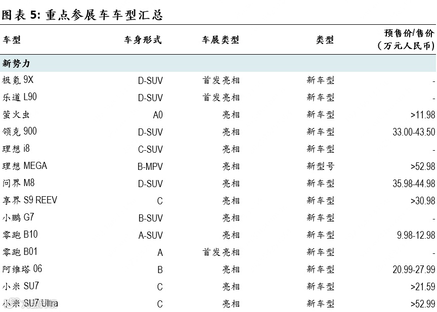 根据乘联会数据,2024年自主品牌在中国内地乘用车市场份额约60%,本次车展自主品牌依旧展现了强劲的实力,并不断下沉智驾、智能座舱、高压快充等技术的应用,有望加速新能源渗透并普及中国乘用车的智能化。重点关注首次亮相的车型,包括乐道L90、极氪9X、零跑 B01,以及合资品牌智能升级代表车型奥迪A5L、凯迪拉LYRIQ-V等。