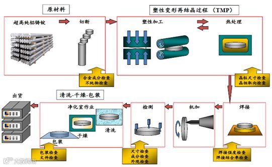 江丰电子的铝靶、钛靶的原材料超高纯度金属铸锭需要向美、日等跨国企业采购,其尚未掌握高纯度金属的提炼工艺。江丰电子的技术主要体现在下图中的“塑性变形再结晶过程(TMP)”环节中,该环节,需要对高纯度金属“圆饼”进行塑性加工,控制晶粒度以及结晶取向,属于高端技术。