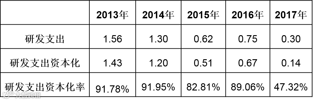ST信通2017年研发支出资本化水平较低,这是因为当年净利润亏损,无必要进行净利润粉饰,反而是财务洗澡的机会。借此机会,ST信通2017年还计提了1.51亿元的无形资产减值。