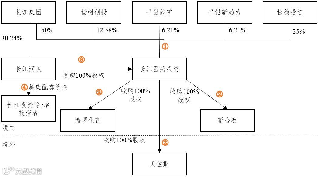 ③长江润发向长江集团、杨树创投、平银能矿、平银新动力和松德投资发行股份并支付现金收购长江医药投资100%股权。