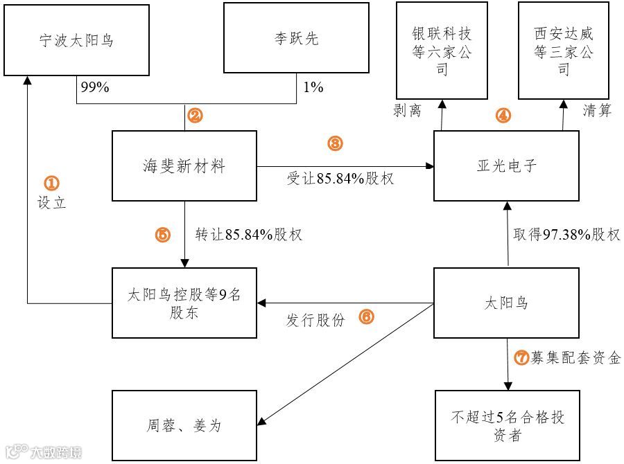 ⑥太阳鸟向太阳鸟控股等9名股东和亚光电子原股东周蓉、姜为发行股份,收购亚光电子97.38%股权。