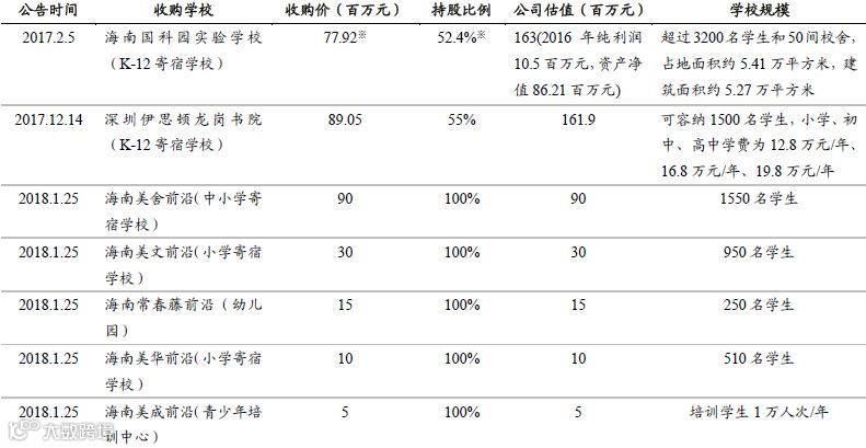 公司上市之后开始借助资本市场展开对其他学校的并购扩张。公司于2017-2018年收购了位于海南、深圳的多所学校,覆盖幼儿园、小学、初中、高中及青少年服务中心,这些学校总计在校生规模超过7000人,青少年服务中心每年服务1万人次,这些学校收购的完成让公司在海南及广东开始扩张。