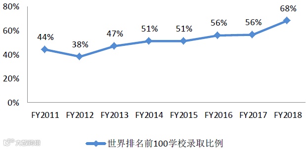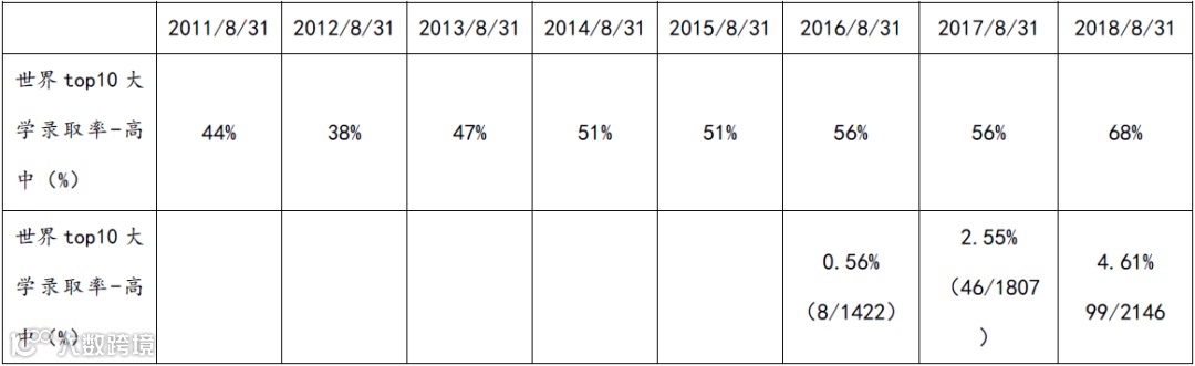 除此之外,按照2019年QS世界名校百强榜中中国大陆高校仅6所入榜,且排名也不甚理想。如果通过国际学校申请国外高校,学生有更大机会申请排名更为靠前的学校。以枫叶教育为例,其历年世界百强名校录取比例如下: