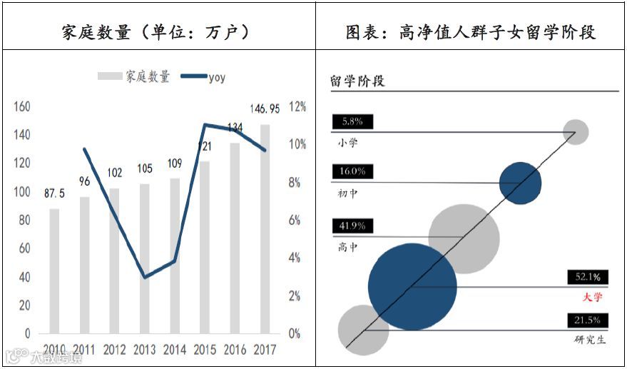 从国内的国际教育行业增长的驱动力上:第一,留学人群的整体增长每年保持11%+复合增速,其中低龄化趋势越来越明显,这是从国际教育市场消费群体的消费意愿上来看;第二,国内的高净值家庭数量增长迅速,2016胡润百富数据显示,这些群体中52.1%计划让孩子在本科期间出国留学,这是从国际教育市场消费群体的消费能力上来看。