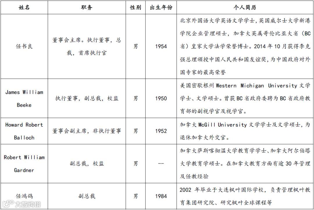 根据上述图表可知,公司在管理层人员配置方面极具匠心。以创始人任书良先生(教育界泰斗级人物)为领导核心,紧密链接加拿大BC省的关系、资源及教学经验,并由具有枫叶学校切身学习经验的任鸿鸽先生承接国际课程“本土化”研究任务。