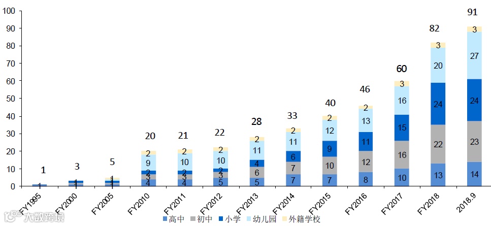 从公司旗下各类学校数量来看,公司学校覆盖K12各阶段,学校数量高速增加且近年增速有所提升。存量来看,截至2018年10月,公司拥有91所学校,其中高中14所,初中23所,小学24所,幼儿园27所,外籍子女学校3所。增量来看,FY2015-2018平均每年增加14所学校,相较之前每年新增1-7所而言,增速明显提升。而公司学校扩张速度提升,主要得益于轻资产模式和外延并购。