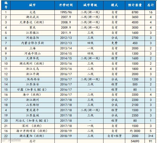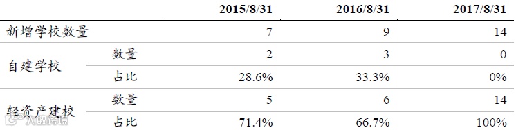 公司的轻资产扩张模式,主要有租赁和合作利润分成两种模式。具体由合作方提供土地校舍装修,公司来运营,合作方主要是地方政府,也有少数为地产商。