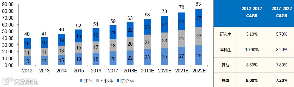 图表:2012-2022E参与海外留学教育的中国学生数量(万人)
