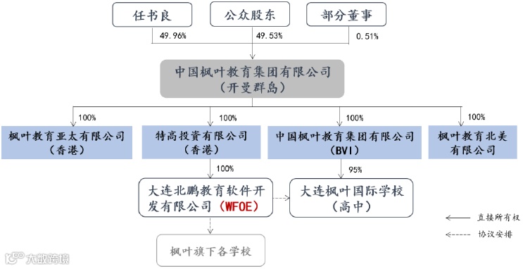 VIE协议构架,透过境内北鹏软件获取枫叶各学校经济利益。公司直接持有特高投资、枫叶亚洲、MapleBVI及枫叶北美四家子公司,通过特高投资间接控股北鹏软件(WFOE)。北鹏软件与公司各综合联属实体(VIE)订立合作协议,约定向各VIE提供服务并收取服务费,公司以北鹏软件的收入向股东进行股息及其他现金分派。