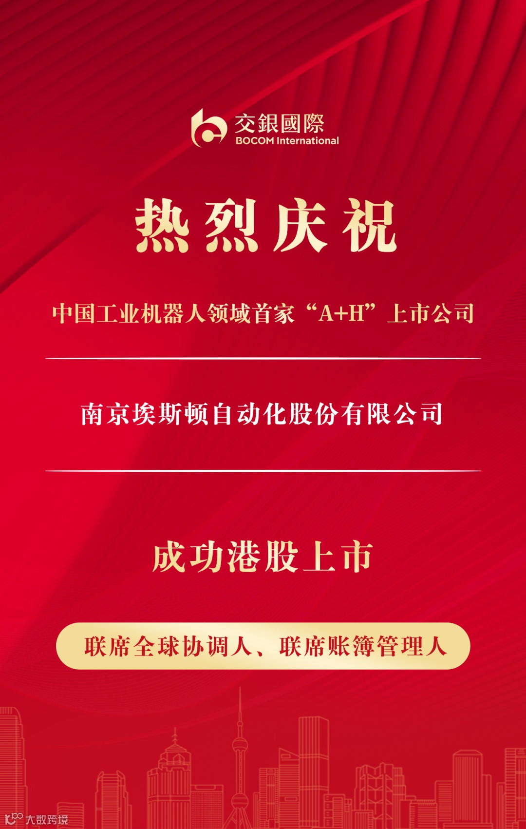 作为本次埃斯顿港股上市的核心承销商,交银国际深度参与发行定价和投资者拓展等各个环节,为发行人与投资者搭建起高效畅通的沟通桥梁。依托银行系投行的集团协同优势、全球化的投资者关系网络,以及在高端制造与工业自动化领域的长期深耕经验,交银国际高效统筹簿记建档与定价分配工作,精准对接境内外长线基金和产业资本,最终助力埃斯顿顺利登陆港交所,成功实现全球化融资与品牌国际提升的双重目标。