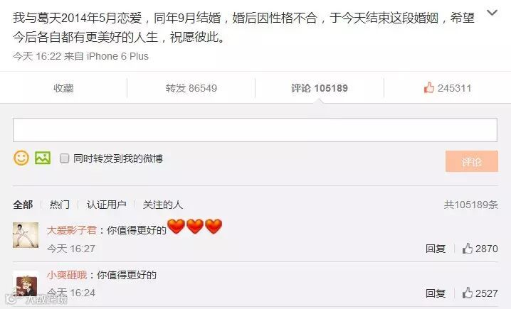 短短的一条消息,转瞬之间已经评论过十万,有人祝福刘翔会找到更好的,有人唏嘘好好的两个人怎么说散就散了,有人感叹再也不相信爱情了,也有人幸灾乐祸看热闹不怕事大。