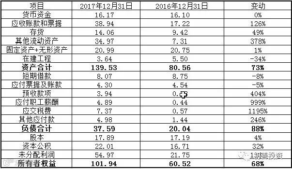一是资产规模增加了73%,由80.56亿增加到了139.53亿元,主要是资本公积及未分配利润的增加,即17年实现净利润的大幅增加,与17年超高的净利润印证。