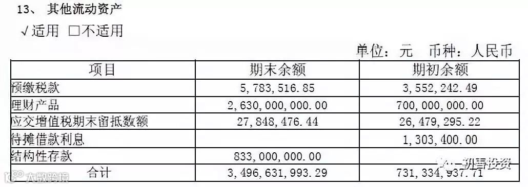二看特殊项目。比如其他流动资产、商誉等等特殊科目。比如方大炭素的其他流动资产高达34.97亿元,我们需要查询附注。查看附注发现公司居然有26.3亿元的资金用于理财,此外还有8.33亿的结构性存款。那么如果都计算在货币资金里,公司的货币资金将高达50.8亿。