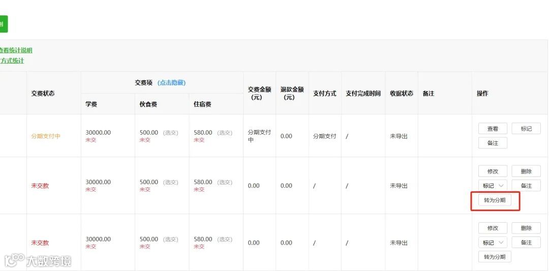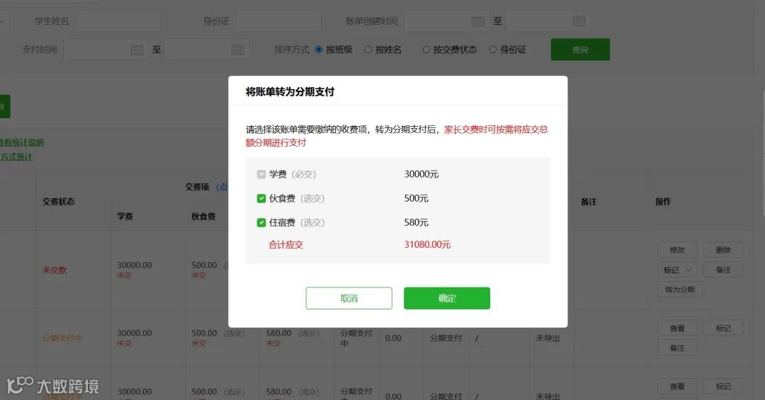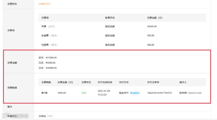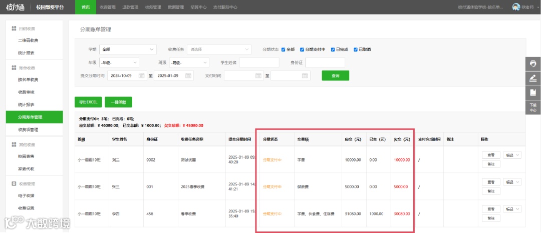 分期支付进度一目了然,学校/机构可随时在平台查看分期账单状态,包括已交、欠交金额,便于及时跟进与催缴,提升收费效率。