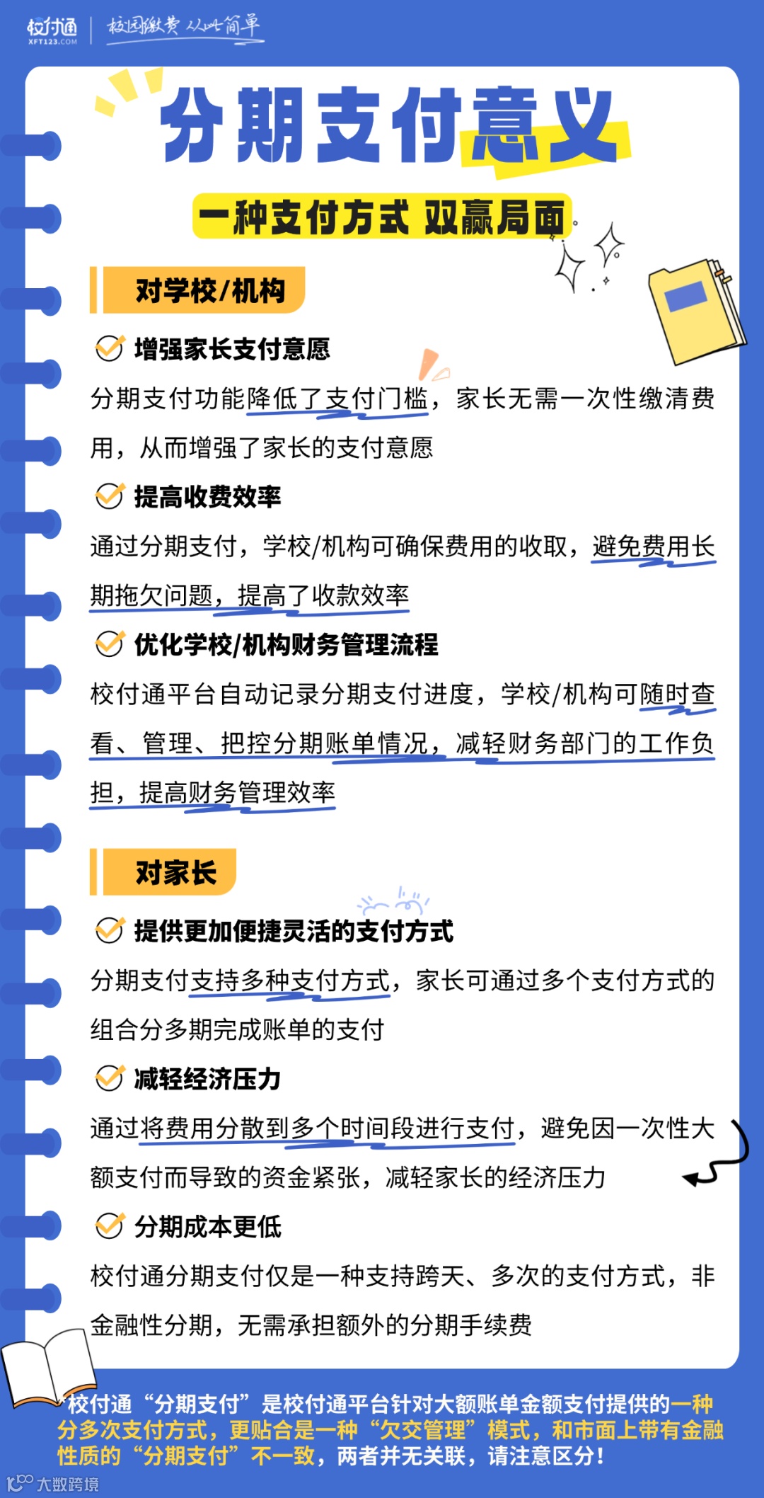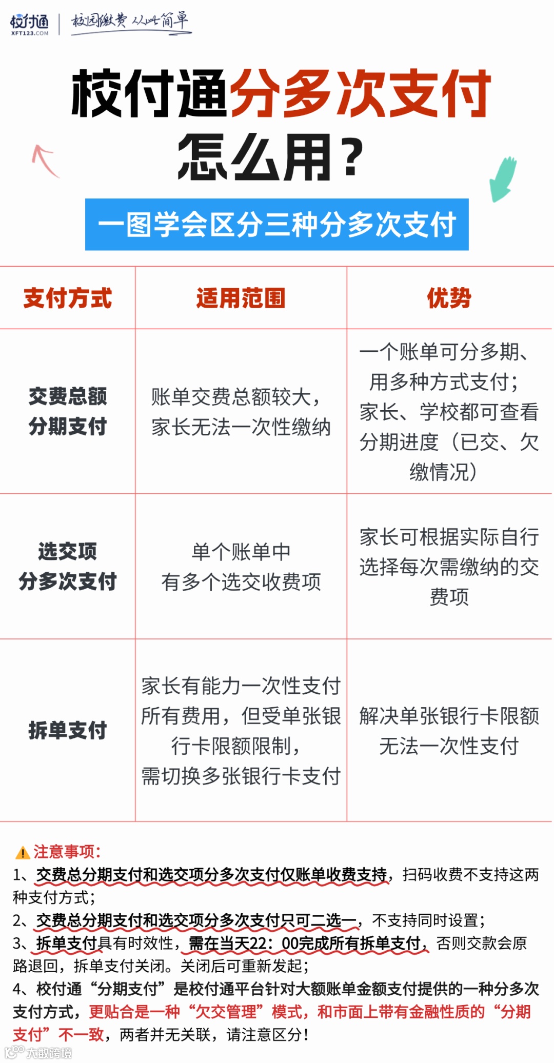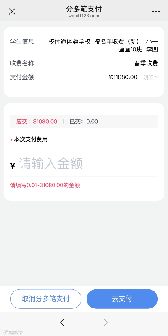 校付通“分期支付”是校付通平台针对大额账单金额支付提供的一种分多次支付方式,更贴合是一种“欠交管理”模式,和市面上带有金融性质的“分期支付”性质不一致,两者并无关联,请注意区分!