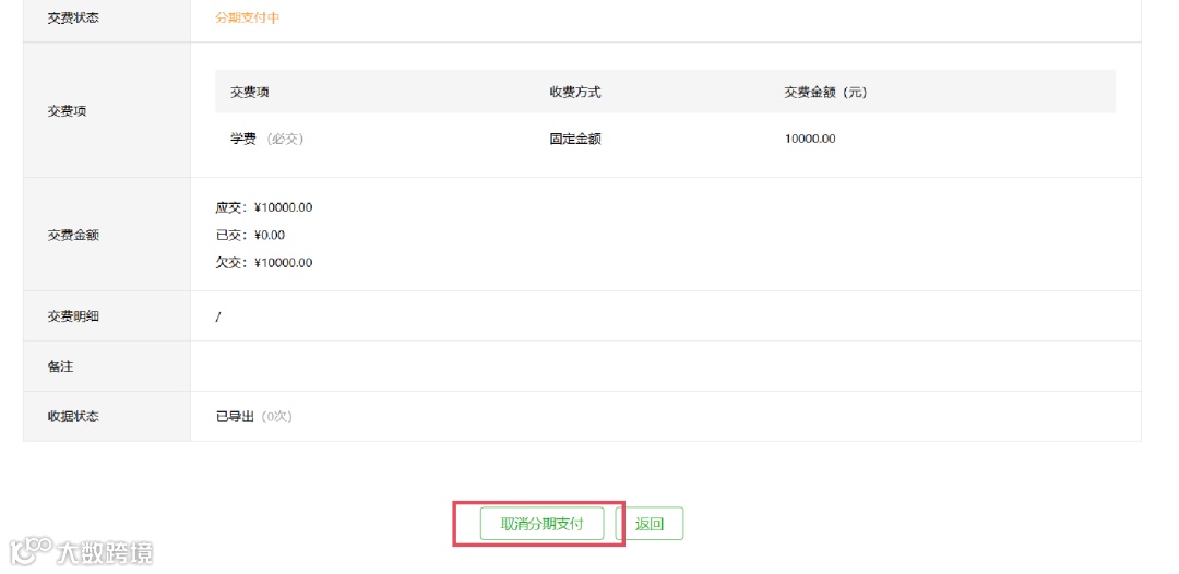 *取消分期的前提:家长已交的费用完成退款后方可取消分期,取消后家长可以一次性缴纳,或重新发起分期