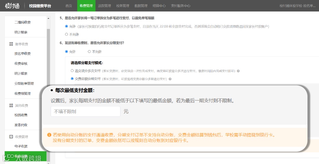 学校/机构可自行设置家长每期支付的最低金额,设置后不仅能有效规划现金流,确保每期稳定收款,还能将分期期数控制在可控范围内。