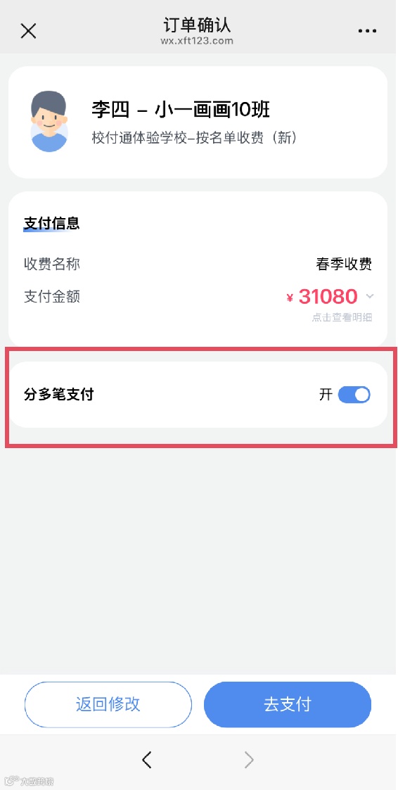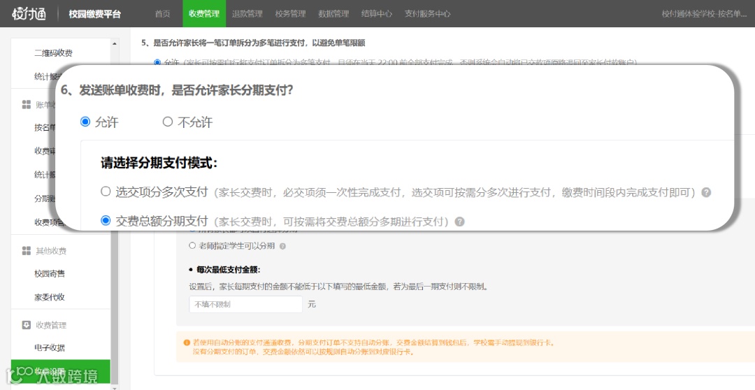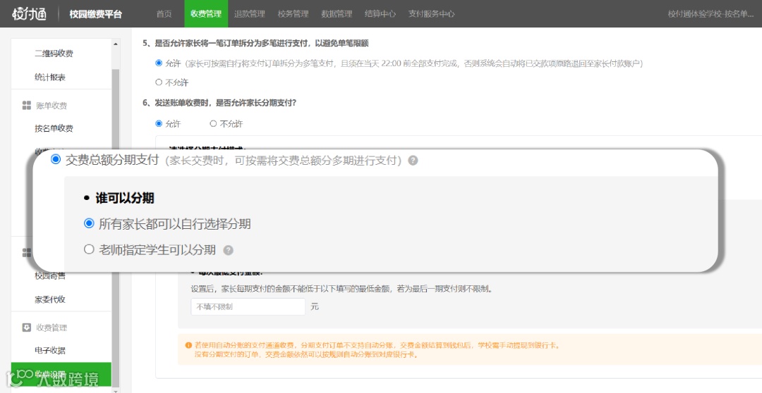 【所有家长】:开放分期支付后,家长在缴费页面可自行选择分期支付