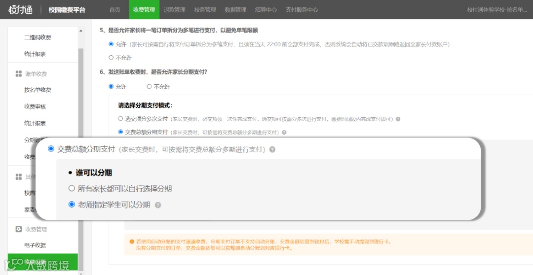 【指定学生】:老师在平台对指定学生账单设置分期,该学生家长在缴费时才可选择分期支付