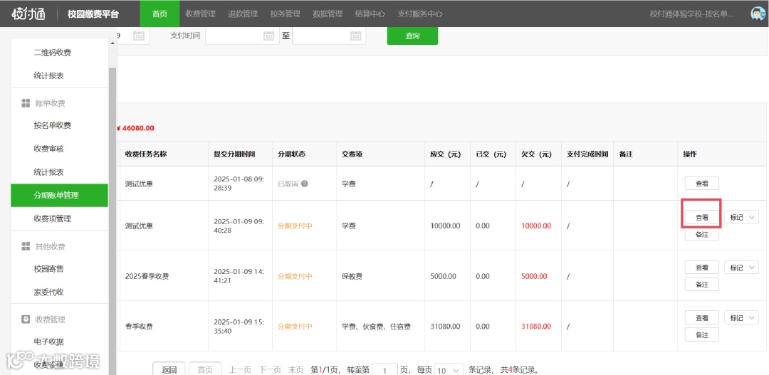 操作路径:收费管理-账单收费-分期账单管理-查看